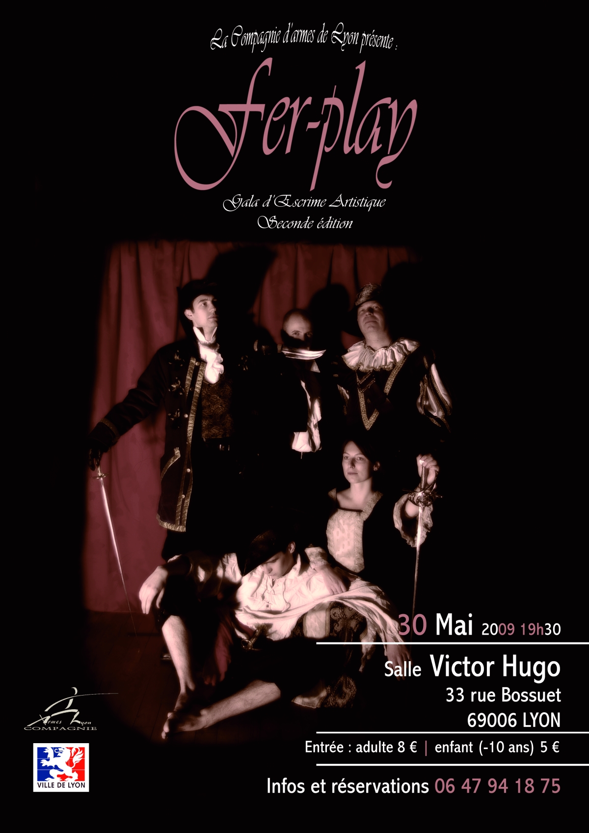 Date Samedi 30 Mai 2009 à 19:30 _MD_EXTCAL_LOCATION_DESCRIPTION : La Compagnie d'Armes de Lyon organise son 2nd Gala d'escrime artistique le samedi 30 Mai 2009. Combats endiablés, cascades, humour, et déclarations théâtrales sont au programme. Venez nous rejoindre pour 2h de spectacle dans la salle Victor Hugo située dans le 6e arrondissement de Lyon. |