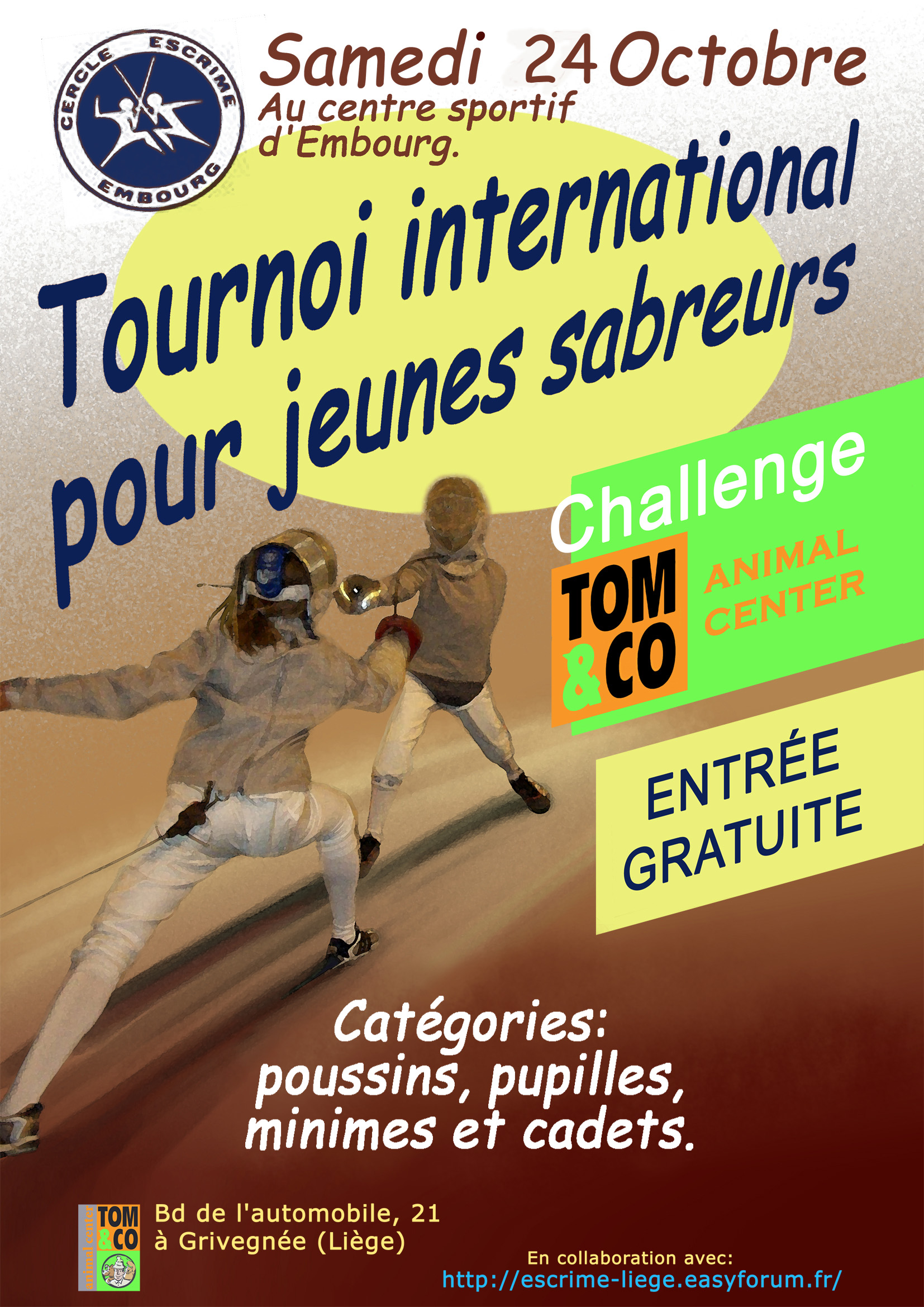 Date Samedi 24 Octobre 2009 à 17:40 _MD_EXTCAL_LOCATION_DESCRIPTION : Tournoi international de Chaudfontaine. Dont la troisième édition du Challenge "Animal Center - Tom and Co" au sabre. Catégories poussins (nés en 2000 et 2001) à cadets (93,94 et 95) |