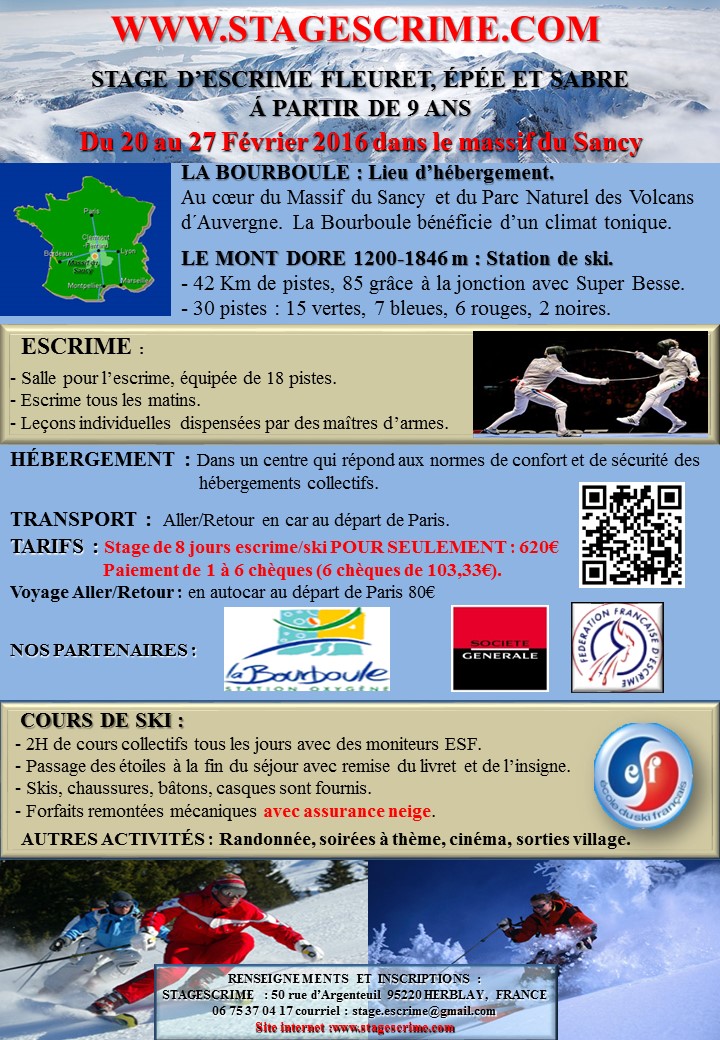 Date Samedi 20 Février 2016 à 00:00 _MD_EXTCAL_LOCATION_DESCRIPTION : 8ème stage d'escrime de la BOURBOULE. Ouvert aux escrimeurs à partir de 9 ans jusqu'à 17 ans pratiquants le fleuret, l'épée ou le sabre. Tous les matins escrime encadrée par des maîtres d'armes. Tous les après midi cours de ski encadrés par des moniteurs ESF. |